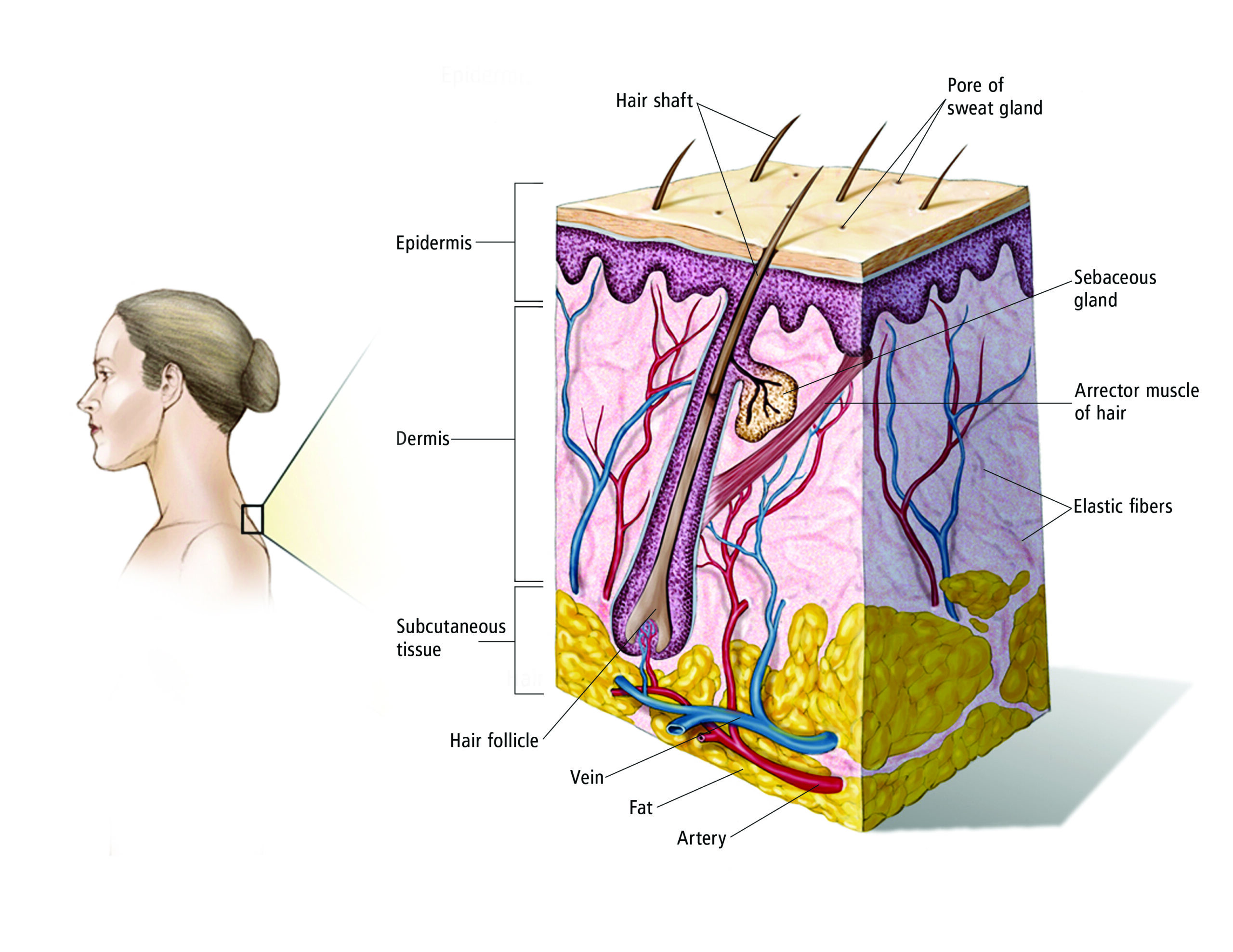 The skin is the largest organ in the body. It protects against infection and injury and helps regulate body temperature. The skin also stores water and fat and produces vitamin D.